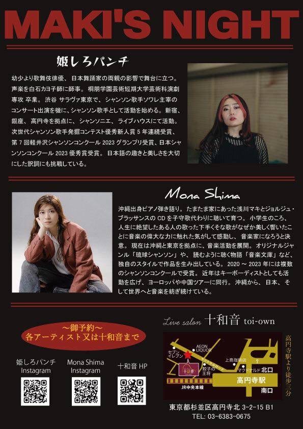 21 9月 2025 十話音toi-own all, Live 2025年9月21日 十話音toi-own 2025.11.21.FRI浅川マキ カバーナイト『DARKNESS 昇』 【Title】 浅川マキ カヴァーナイト『DARKNESS 昇』 【Date】 2025.11.21. FRI open 18:30/start 19:30(2stage) 【Musician】 姫しろパンチ(vocal) Mona Shima(vocal/piano) 菊池麻由(piano) 【Charge】 35oo円+order 【Venue】 十話音 toi-own(とわおん) 〒166-0002 東京都杉並区高円寺北3丁目2-15 珍来ビル B1 メールで予約電話で予約