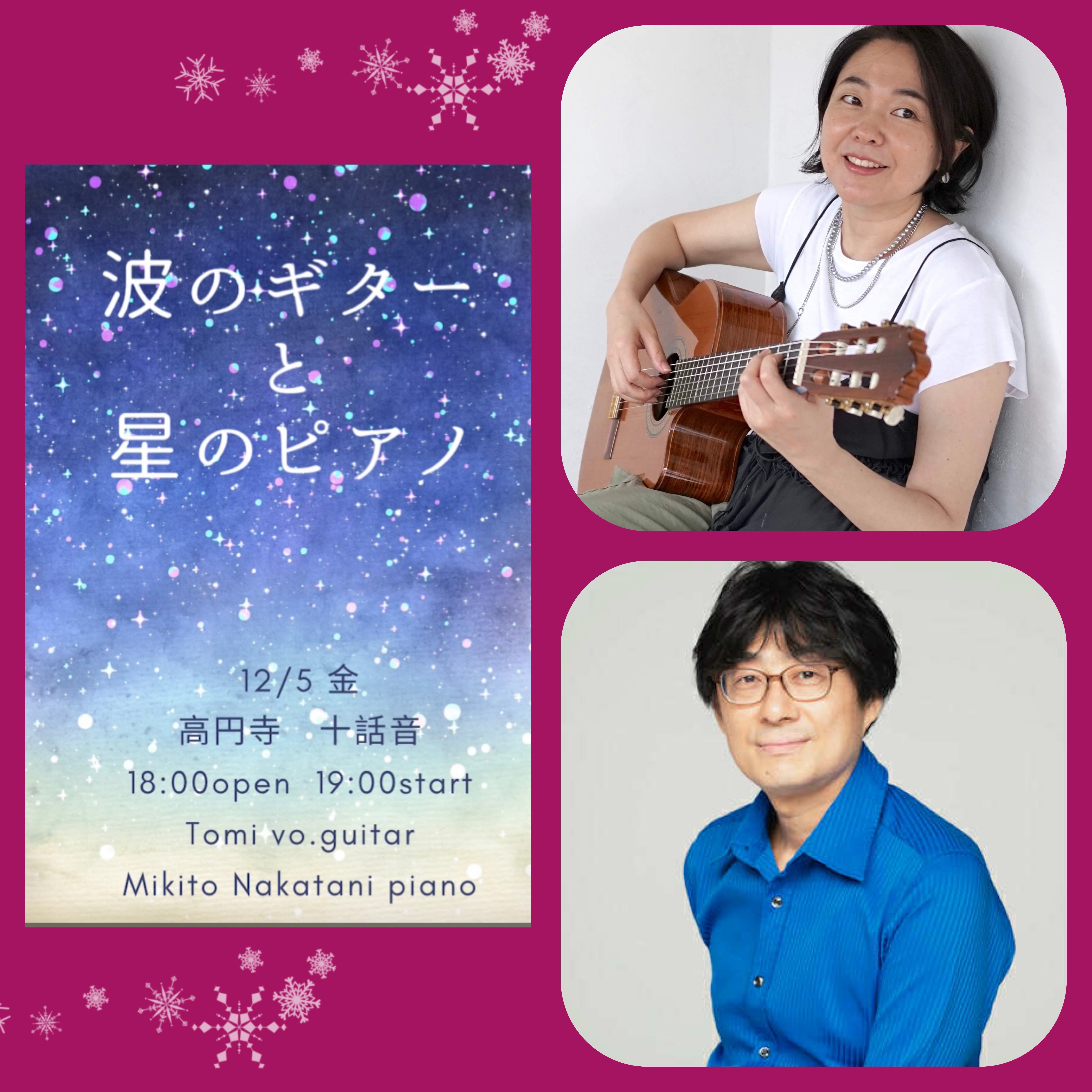 25 10月 2025 十話音toi-own all, Live 2025年10月25日 十話音toi-own 2025.12.05.FRI✨波のギターと星のピアノ✨ 【Title】 ✨波のギターと星のピアノ✨ 【Date】 2025.12.05.FRI open 18:00 / start 19:00(2stage) 【Musician】 Tomi(vocal/guitar) 仲谷幹人(piano) 【Charge】 3500円+order 【Venue】 十話音 toi-own(とわおん) 〒166-0002 東京都杉並区高円寺北3丁目2-15 珍来ビル B1 メールで予約電話で予約