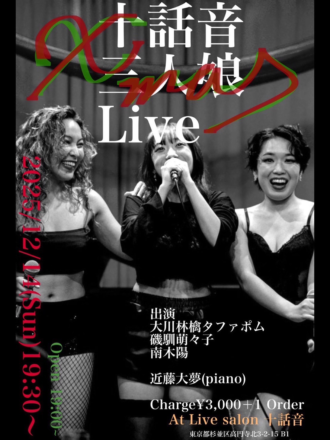 16 11月 2025 十話音toi-own all, Live 2025年11月16日 十話音toi-own 2025.12.14.SUN✨十話音 三人娘✨LIVE vol,3 【Title】 ✨十話音三人娘✨LIVE!! Vol.3 【Date】 2025.12.14. SUN open 19:00 / start 19:30 【Musician】 大川林檎タファポム(vocal) 磯馴萌々子(vocal) 南木陽(vocal) 近藤大夢(piano) 【Charge】 charge 3000円+order 【Venue】 十話音 toi-own(とわおん) 〒166-0002 東京都杉並区高円寺北3丁目2-15 珍来ビル B1 メールで予約電話で予約