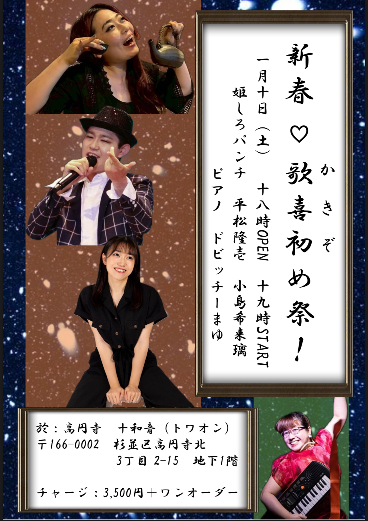 シャンソンコンクールで出会った三人が、今宵はミュージカル曲中心に賑やかにお送りいたします。