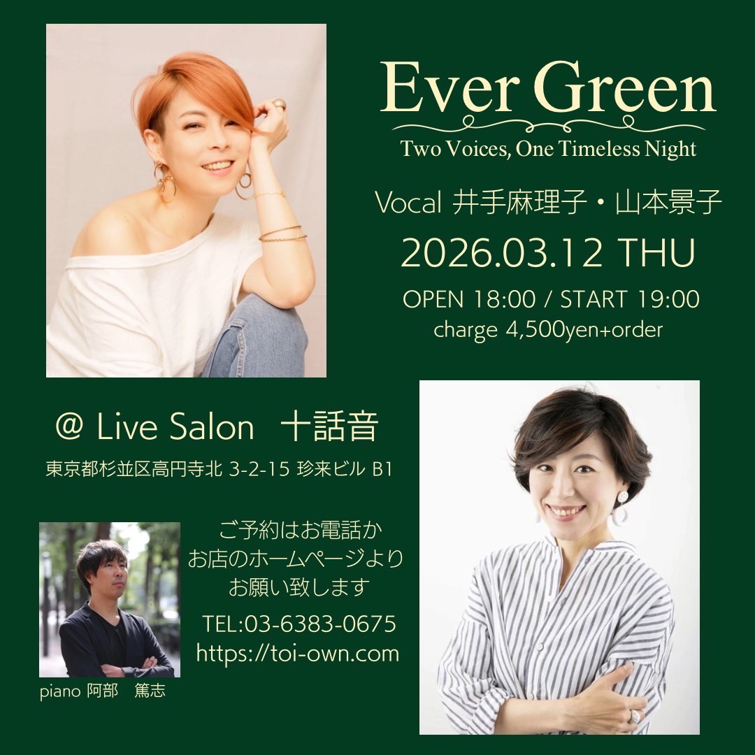 24 1月 2026 十話音toi-own all, Live 2026年1月24日 十話音toi-own 2026.03.12.THU『Ever Green』〜Two Voices,One Timeless Night〜井手麻理子&山本景子(K.) 【Title】 『Ever Green』 〜Two Voices,One Timeless Night〜 【Date】 2026.03.12. THU open 18:00/start 19:00(2stage) 【Musician】 井手麻理子(vocal) 山本景子(K.)(vocal) 阿部篤志(piano) 【Charge】 4500円+order 【Venue】 十話音 toi-own(とわおん) 〒166-0002 東京都杉並区高円寺北3丁目2-15 珍来ビル B1 メールで予約電話で予約