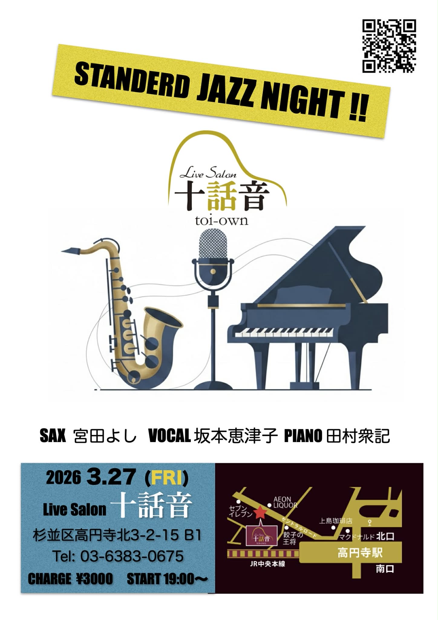 30 1月 2026 十話音toi-own all, Live 2026年1月30日 十話音toi-own 2026.03.27.FRI宮田よし(sax) STANDARD JAZZ NIGHT!! 【Title】 宮田よし(sax)STANDARD JAZZ NIGHT!! 【Date】 2026.03.27. FRI open 18:00 / start 19:00 【Musician】 坂本恵津子(vocal) 宮田よし(sax) 田村衆記(piano) 【Charge】 charge 3000円+order 【Venue】 十話音 toi-own(とわおん) 〒166-0002 東京都杉並区高円寺北3丁目2-15 珍来ビル B1 メールで予約電話で予約