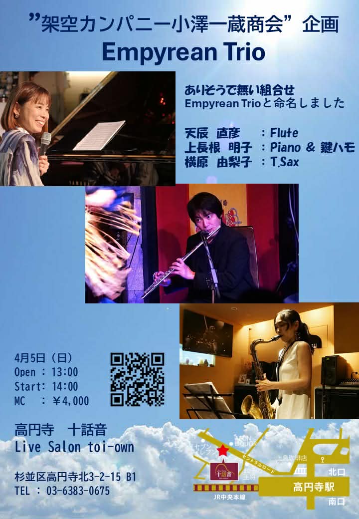 02 2月 2026 十話音toi-own all, Live 2026年2月2日 十話音toi-own 2026.04.05.SUN【☀️昼の部☀️】”架空カンパニー小澤一蔵商会”企画Empyrean Trio 【Title】 “架空カンパニー小澤一蔵商会”企画 Empyrean Trio 【Date】 2026.04.05. SUN open 13:00 / start 14:00(2stage) 【Musician】 天辰直彦(flute) 上長根明子(piano/鍵盤ハーモニカ) 横原由梨子(sax) 【Charge】 charge 4000円+order 【Venue】 十話音 toi-own(とわおん) 〒166-0002 東京都杉並区高円寺北3丁目2-15 珍来ビル B1 メールで予約電話で予約