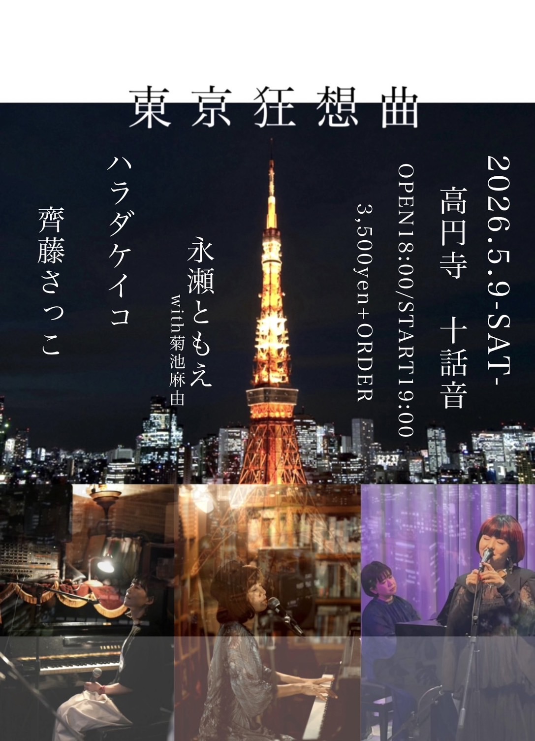 24 2月 2026 十話音toi-own all, Live 2026年2月24日 十話音toi-own 2026.05.09.SAT東京狂想曲 【Title】 東京狂想曲 【Date】 2026.05.09. SAT open 18:00 / start 19:00 【Musician】 斉藤さっこ(vocal/piano) ハラダケイコ(vocal/piano) 永瀬ともえ(vocal)with 菊池麻由(piano) 【Charge】 charge 3500円+order 【Venue】 十話音 toi-own(とわおん) 〒166-0002 東京都杉並区高円寺北3丁目2-15 珍来ビル B1 メールで予約電話で予約