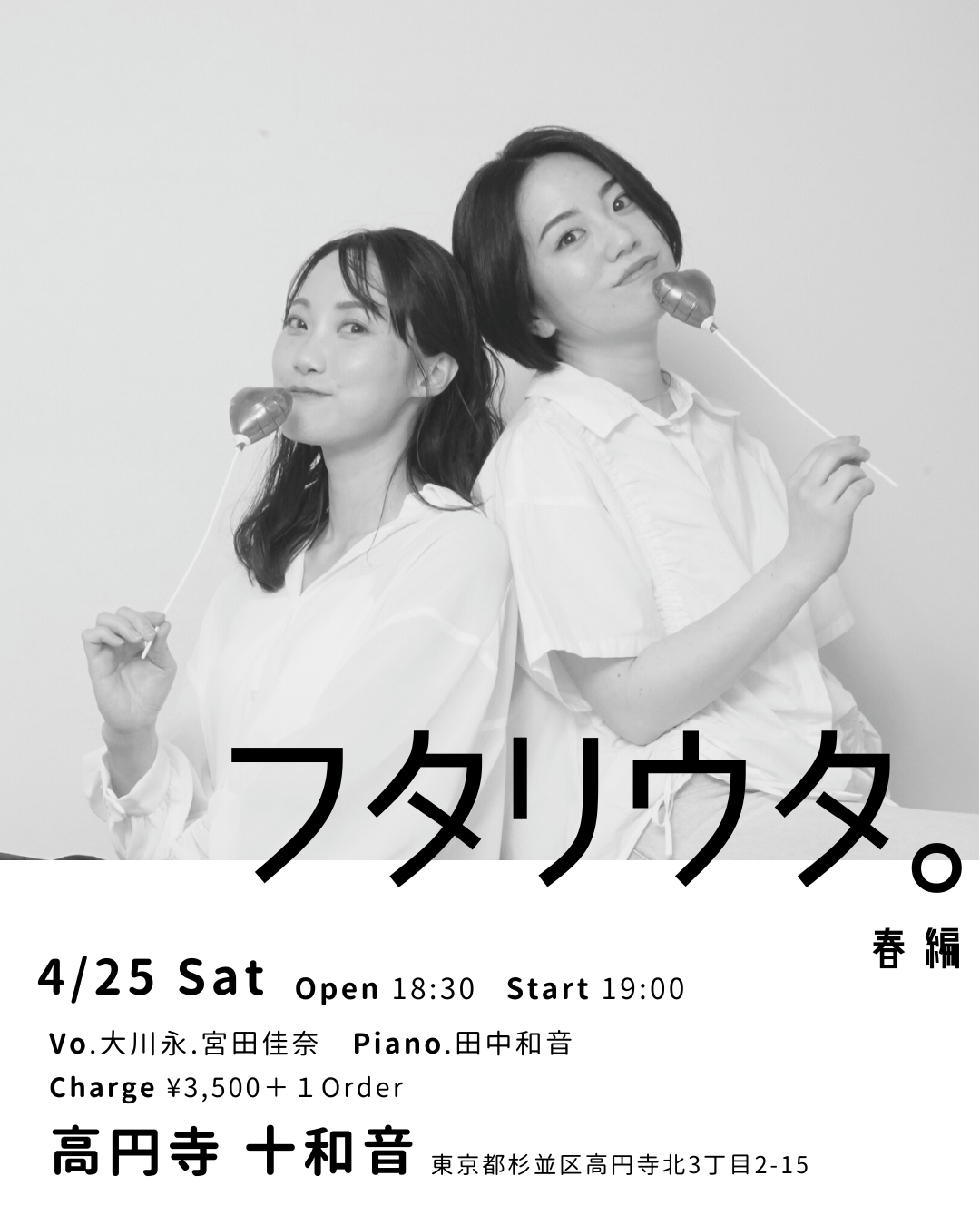 04 3月 2026 十話音toi-own all, Live 2026年3月4日 十話音toi-own 2026.04.25.SAT『フタリウタ。』[春編]大川永&宮田佳奈 【Title】 フタリウタ。[春編] 【Date】 2026.04.25. SAT open 18:30 / start 19:00 【Musician】 大川永(vocal) 宮田佳奈(vocal) 田中和音(piano) 【Charge】 charge 3500円+order 【Venue】 十話音 toi-own(とわおん) 〒166-0002 東京都杉並区高円寺北3丁目2-15 珍来ビル B1 メールで予約電話で予約