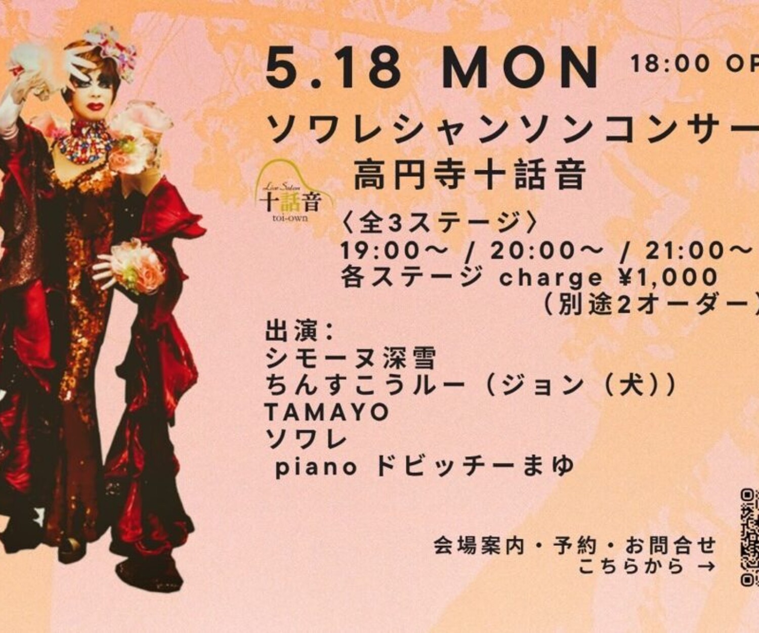 all, Live 08 4月 2026 2026.05.18.MONソワレシャンソンコンサート#340 / シモーヌ深雪inTOKYO🃏タロット占い有り 【Title】 🇫🇷ソワレシャンソンコンサート#340 【Date】 2026.05.18. MON 【Guest】 シモーヌ深雪 ちんすこうルー TAMAYO 【Host】 ソワレ ドビッチーまゆ(piano) 【Information】 ⭐️3ステージ入替制⭐️ 1ステージ 【1000円+2オーダー】 🔴1ステージご覧になってから2ステージ、3ステージも観たい場合お気軽に受付にお申し付けください。 🔴その時新たに2オーダーはかかりません。 ◉18:00オープン/19:00スタート 〈1st〉19:00〜19:40… 十話音toi-own