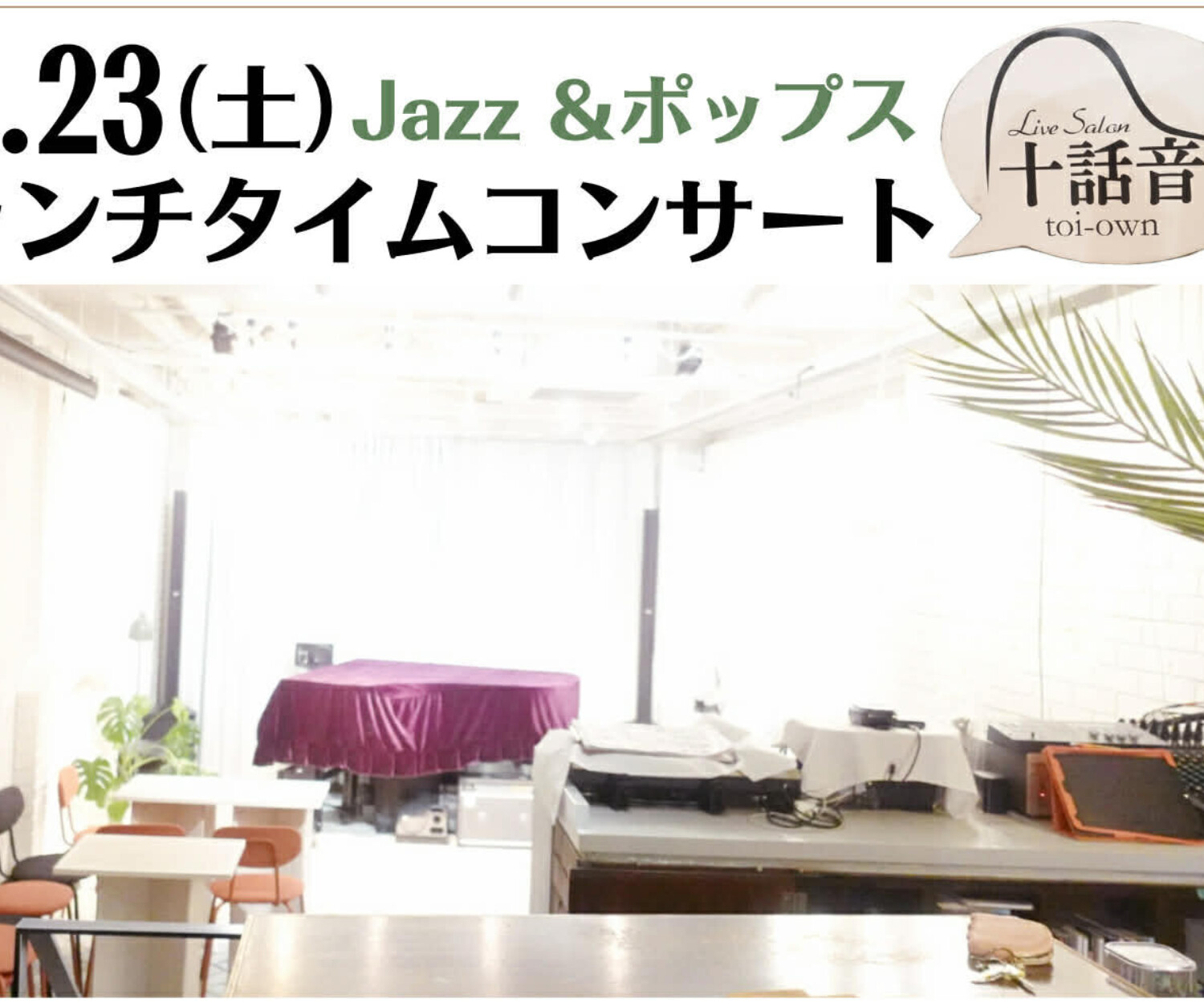 all, Live 09 4月 2026 2026.05.23.SAT☀️ランチタイムコンサート☀️JAZZ&POPSコンサート 【Title】 ☀️ランチタイムライブ☀️ JAZZ&POPSコンサート 【Date】 2026.05.23.SAT ☀️ランチタイム / 11:00〜16:00☀️(L.O. 15:30) 🎻演奏 Start /(1st) 13:00〜13:45 / (2nd)14:00〜14:45 【Musician】 重久義明(piano) 栗田智香子(vocal) 【Charge】 NO… 十話音toi-own