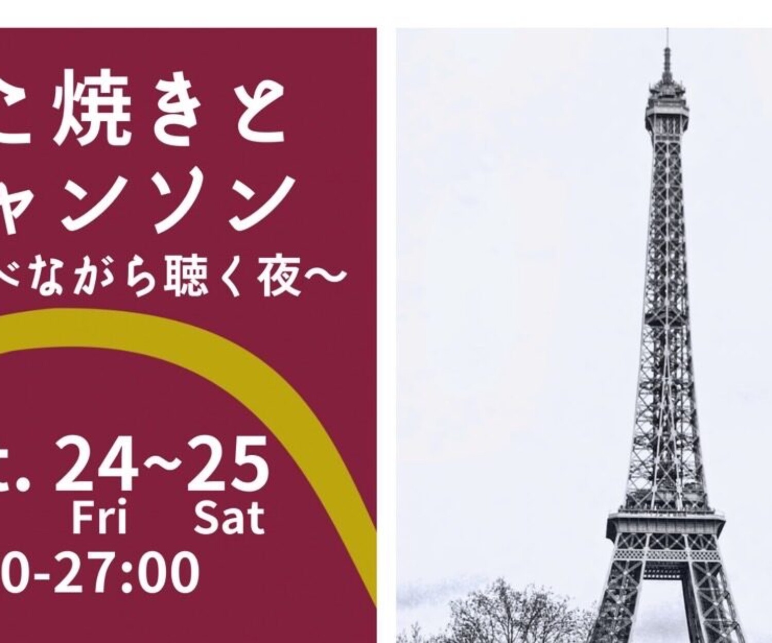 all 23 9月 2025 2025.10.24.FRI&25.SAT🇫🇷🐙たこ焼きとシャンソン🐙🇫🇷 【Title】 🇫🇷🐙たこ焼きとシャンソン🐙🇫🇷 〜食べながら聴く夜〜 【Date】 2025.10.24.FRI〜25.SAT 19:00~27:00 【charge】 500円 秋の夜長、皆でくくりながらしっぽりと…. スタッフ一同お待ち申し上げます🐙♨️ 十話音toi-own