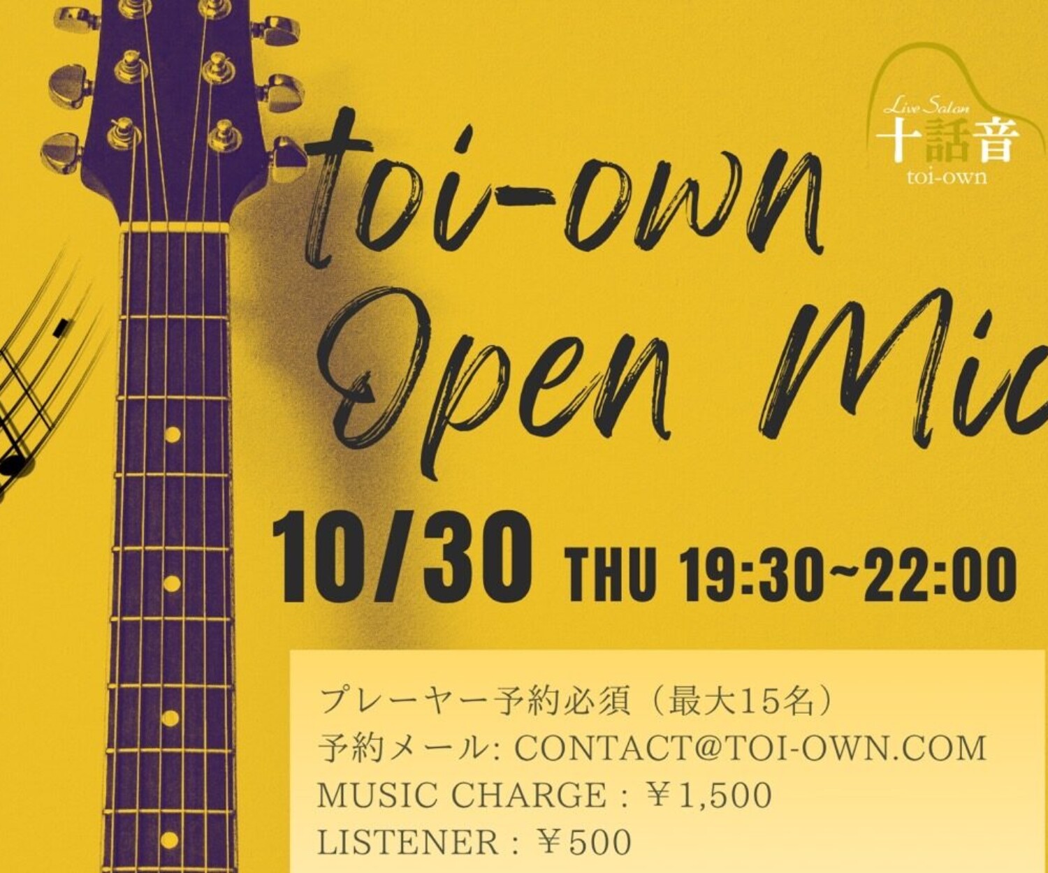 all 02 10月 2025 2025.10.30.THUTOI-OWN OPEN MIC vol.3 【Title】 TOI-OWN OPEN MIC vol.2 【Date】 2025.10.30.THU open 19:30(〜22:00) 【Host】 KASHIRA3 【Charge】 参加者 / 1500円+order リスナー / 500円+order ⭐️参加者はご予約をお願いいたします。 ⭐️譜面/コード譜… 十話音toi-own