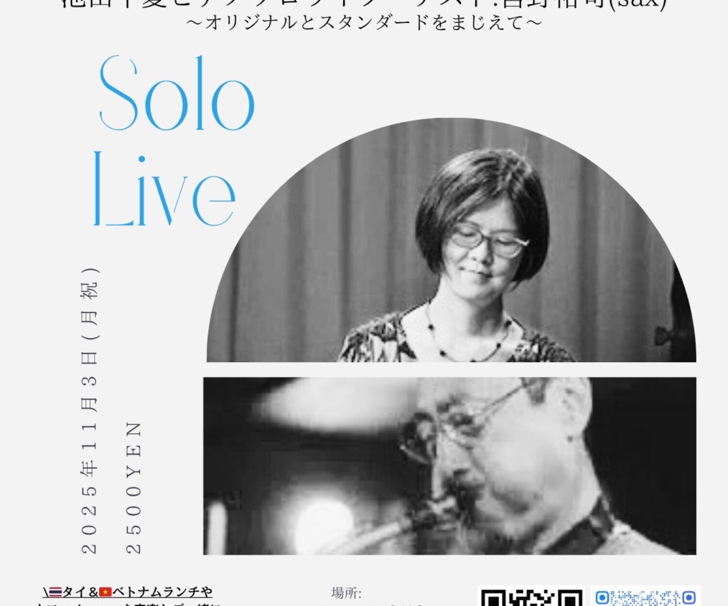 all, Live 18 10月 2025 2025.11.03.MON【☀️昼の部 / JAZZ☀️】池田千夏(piano)SOLO LIVE 【Title】 昼の部 / 池田千夏(piano)ソロライブ 〜オリジナルとスタンダードをまじえて〜 【Date】 2025.11.03.MON open 11:00 start [1st]13:30~14:10 /[2nd] 14:30~15:10(2stage) 【Musician】 池田千夏(piano) Guest:宮野裕司(sax) 【Charge】 2500円+order 🇹🇭タイ&🇻🇳ベトナムランチやカフェメニューを音楽とご一緒にお楽しみいただけます☕️… 十話音toi-own