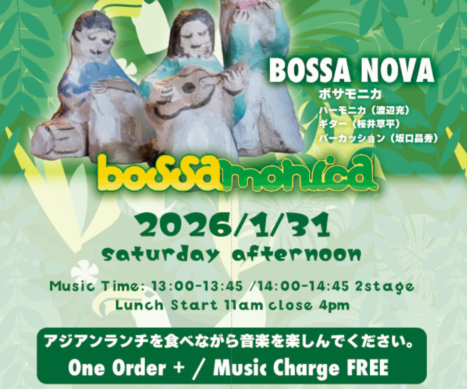 all 19 1月 2026 2026.01.31.SAT【☀️昼の部 / BOSSA NOVA☀️】bossa monica 【Title】 昼の部 / bossa monica 【Date】 2026.01.31.SAT open 11:00(2stage) [1st]13:00~13:45 [2nd] 14:00~14:45 【Musician】 渡辺充(ハーモニカ) 桜井草平(ギター) 坂口昌秀(パーカッション) 【Charge】 FREE+order 🇹🇭タイ&🇻🇳ベトナムランチやカフェメニューを音楽とご一緒にお楽しみいただけます☕️… 十話音toi-own