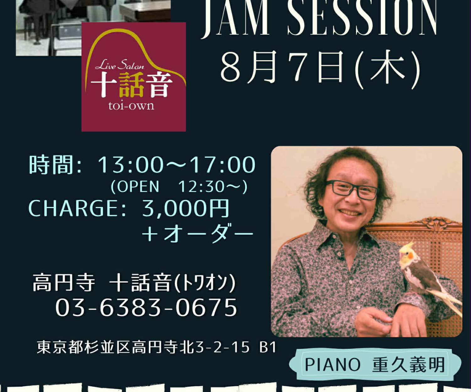 all 05 6月 2025 2025.08.07.THU【☀️昼の部/Session☀️】重久義明(piano)Vocal Jam Session vol.2 【Title】 重久義明 VOCAL JAM SESSION vol.2 【Date】 ☀️DayTime VOCAL JAM SESSION☀️ 2025.08.07. THU open 12:30 / start 13:00〜17:00 【Host… 十話音toi-own
