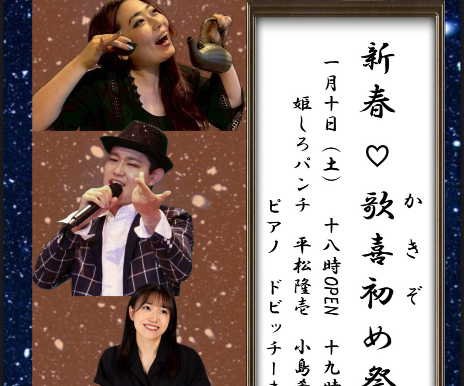 all, Live 30 11月 2025 2026.01.10.SAT新春♡歌喜初め(かきぞめ)祭! 【Title】 新春♡歌喜初め(かきぞめ)祭! 【Date】 2026.01.10.SAT open 18:00/start 19:00 【Musician】 平松隆壱(vocal) 姫しろパンチ(vocal) 小島希来璃(vocal) ドビッチーまゆ(piano) 【Charge】 3500円+order シャンソンコンクールで出会った三人が、今宵はミュージカル曲中心に賑やかにお送りいたします。 【Venue】 十話音 toi-own(とわおん) 〒166-0002 東京都杉並区高円寺北3丁目2-15… 十話音toi-own